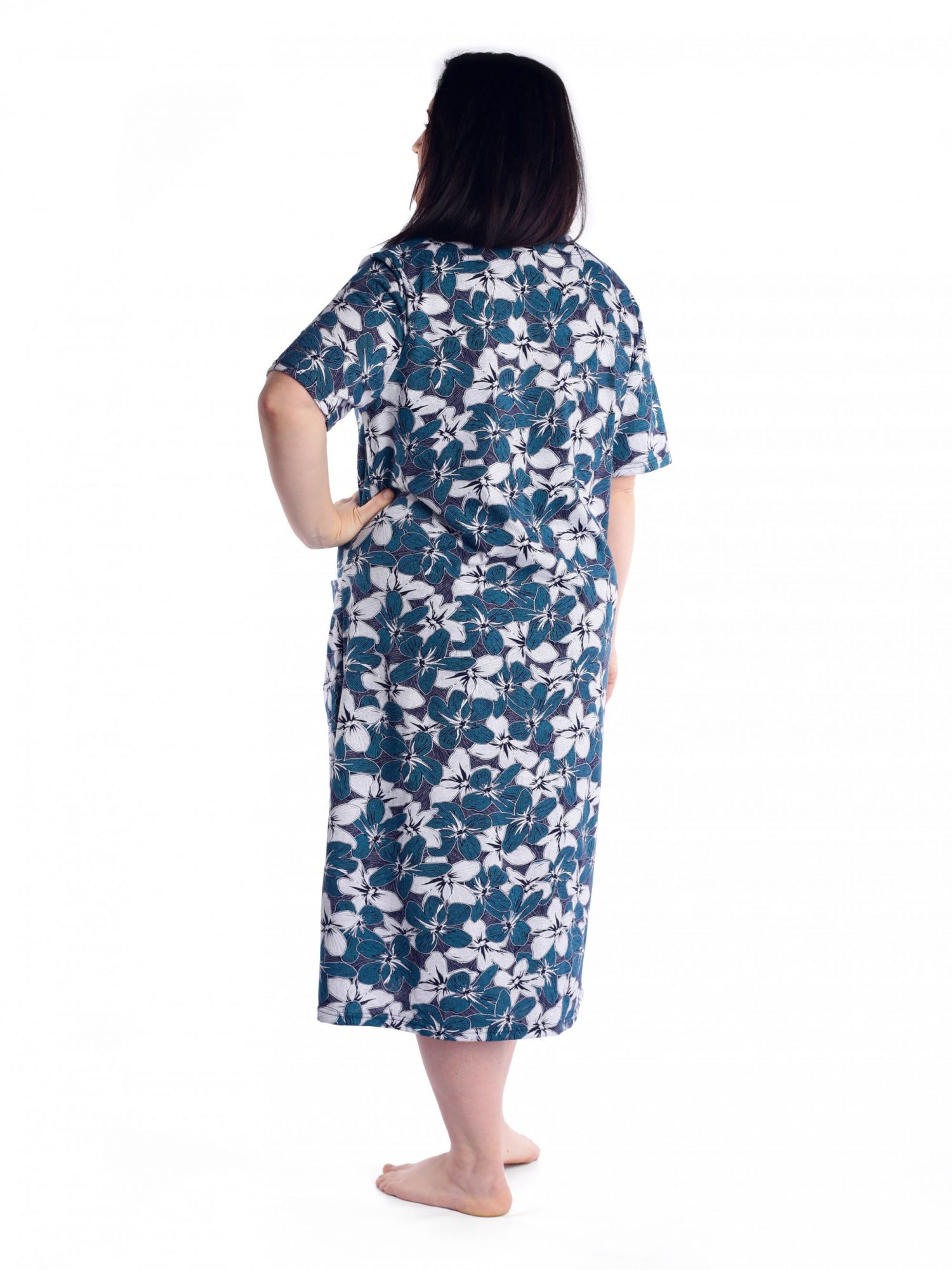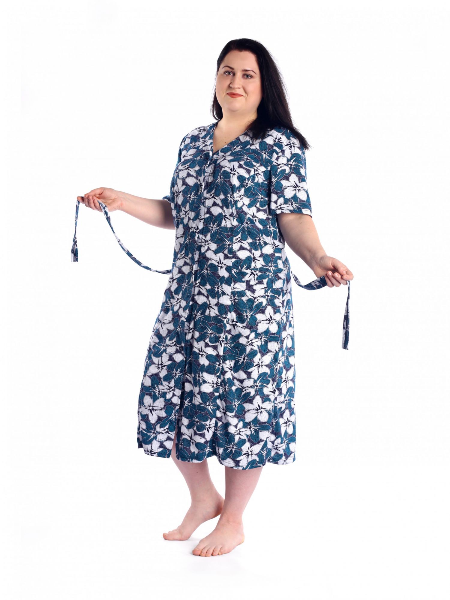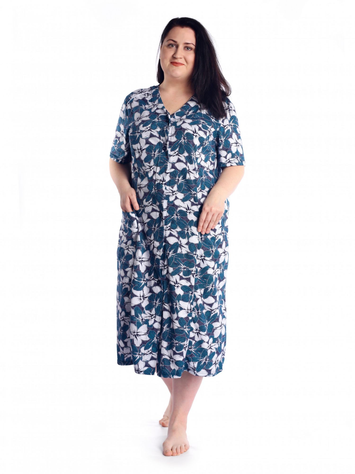 Женский трикотажный халат больших размеров из 100% хлопка. Красивый рисунок, короткий рукав, удобные карманы, застежка на пуговицах и хлопковая ткань делает этот халат идеальным вариантом домашней одежды.Удобство и комфорт дома и на даче вам обеспечит эта модель, идеальная длина и приятная ткань подарят вам чувство радости после покупки. Халат отлично подойдет для подарка женщинам, девушкам и бабушкам к любому празднику .