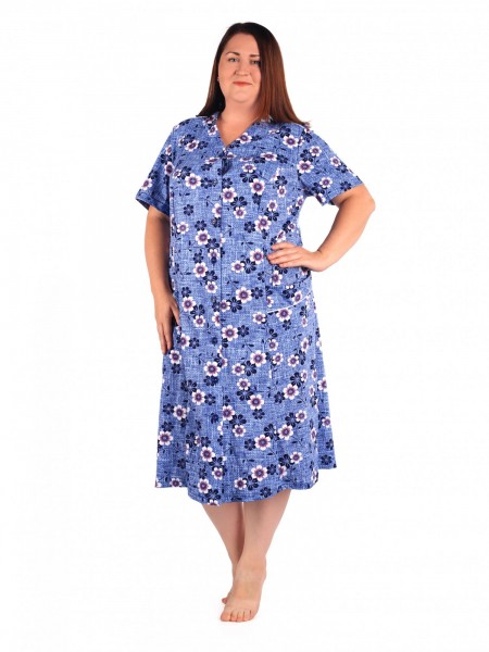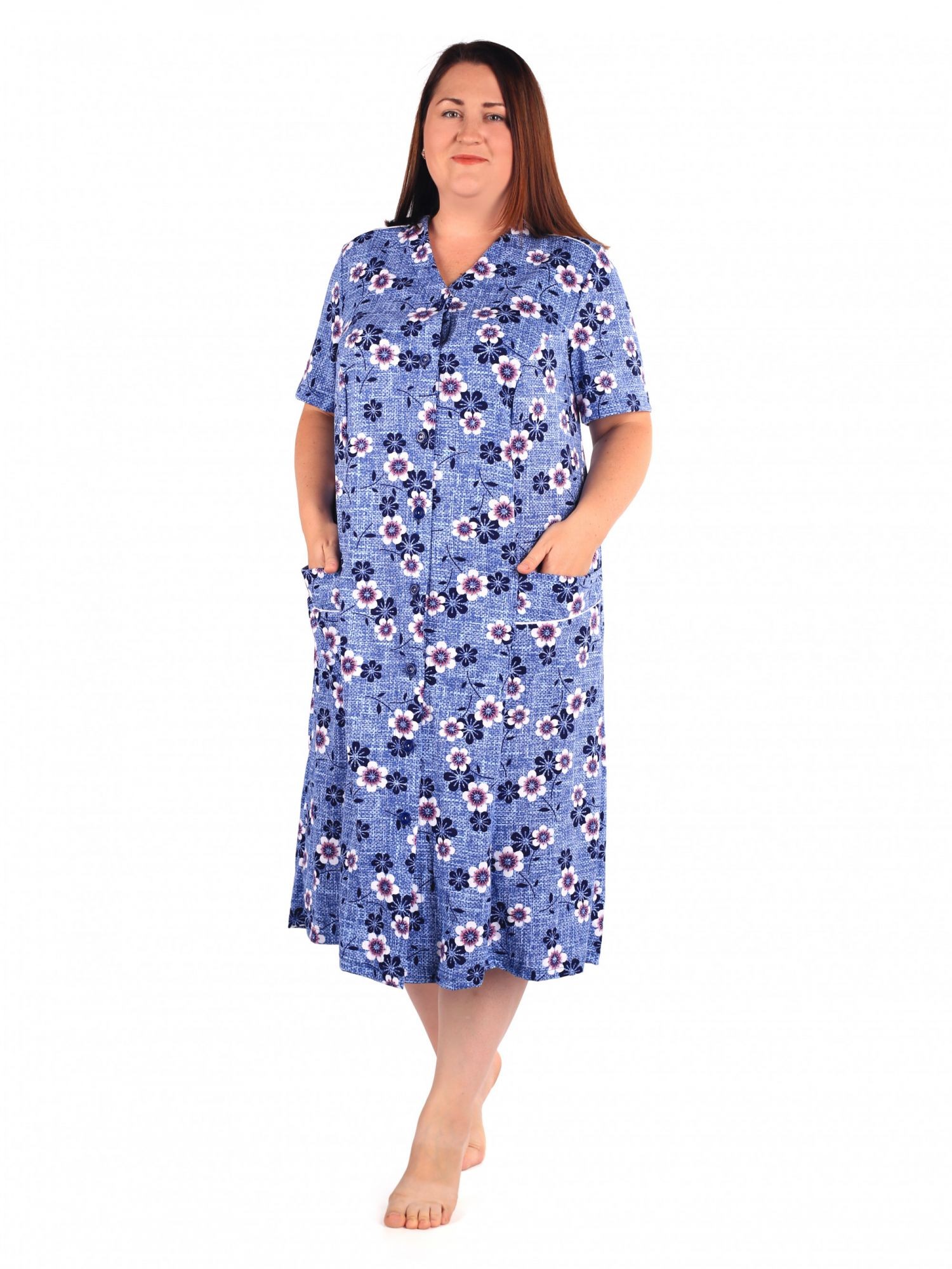 Женский трикотажный халат больших размеров из 100% хлопка. Красивый рисунок, короткий рукав, удобные карманы, застежка на пуговицах и хлопковая ткань делает этот халат идеальным вариантом домашней одежды.Удобство и комфорт дома и на даче вам обеспечит эта модель, идеальная длина и приятная ткань подарят вам чувство радости после покупки. Халат отлично подойдет для подарка женщинам, девушкам и бабушкам к любому празднику .