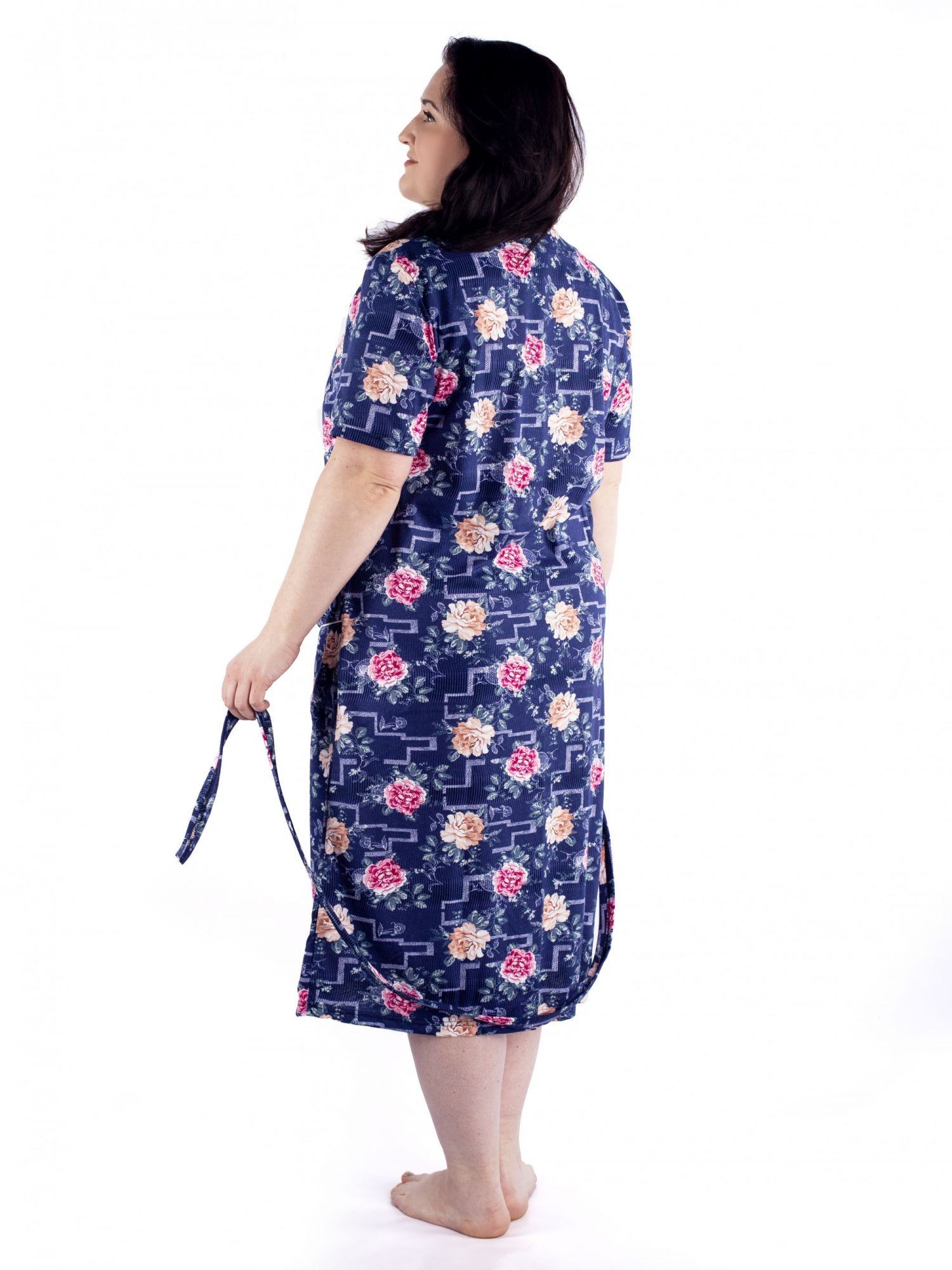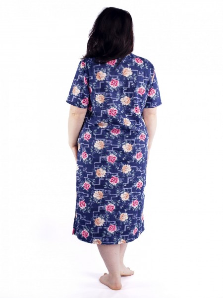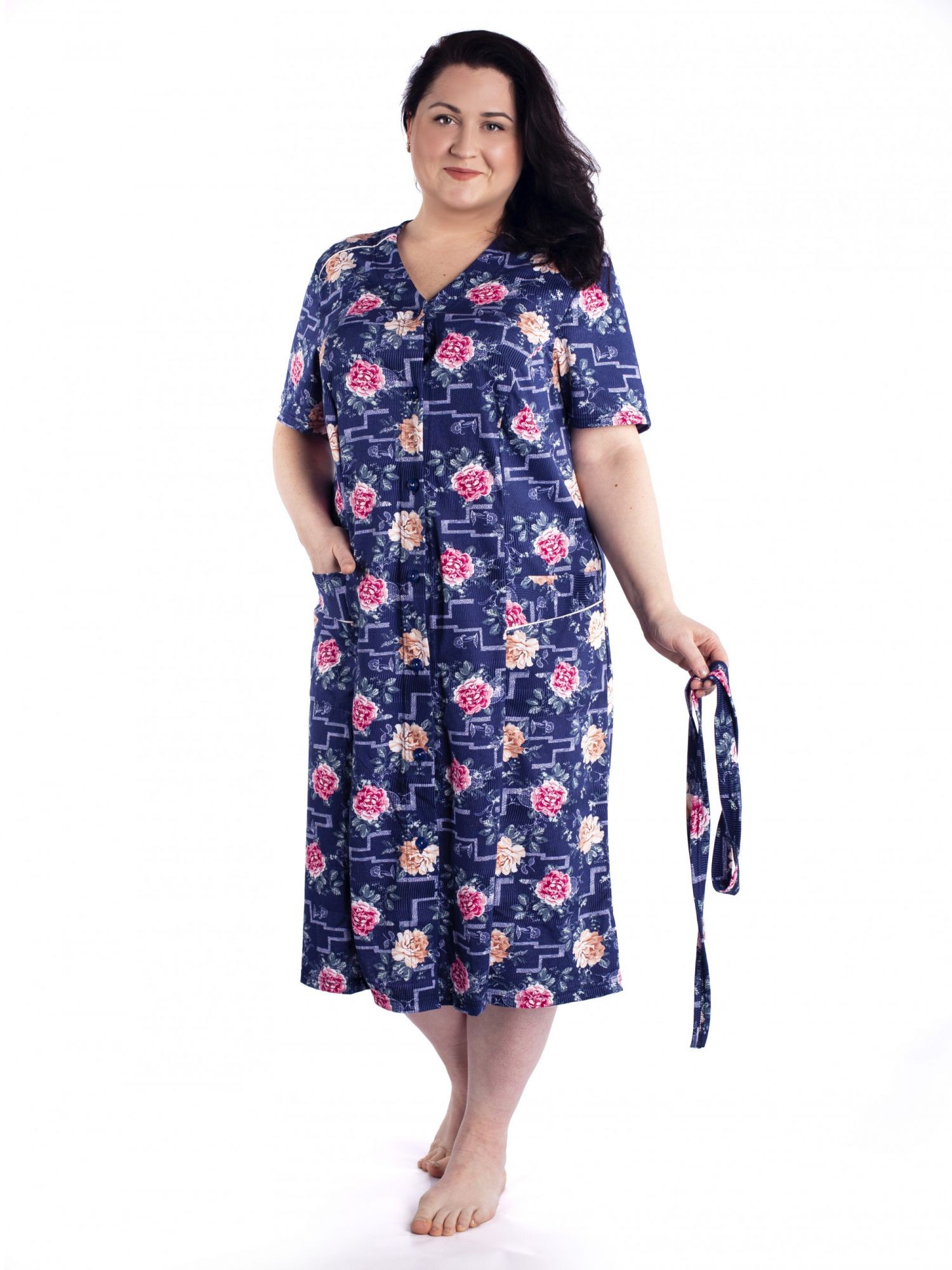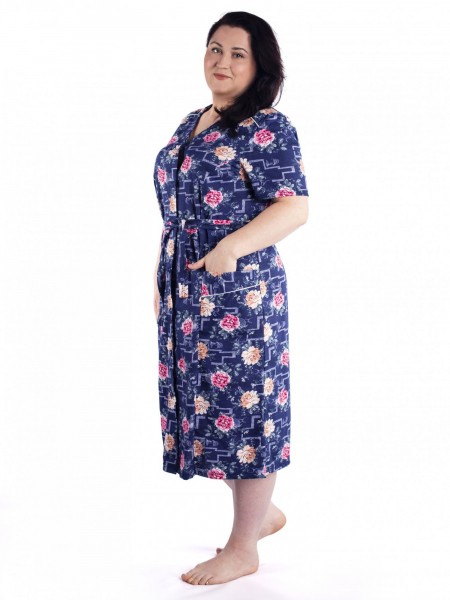 Женский трикотажный халат больших размеров из 100% хлопка. Красивый рисунок, короткий рукав, удобные карманы, застежка на пуговицах и хлопковая ткань делает этот халат идеальным вариантом домашней одежды.Удобство и комфорт дома и на даче вам обеспечит эта модель, идеальная длина и приятная ткань подарят вам чувство радости после покупки. Халат отлично подойдет для подарка женщинам, девушкам и бабушкам к любому празднику .