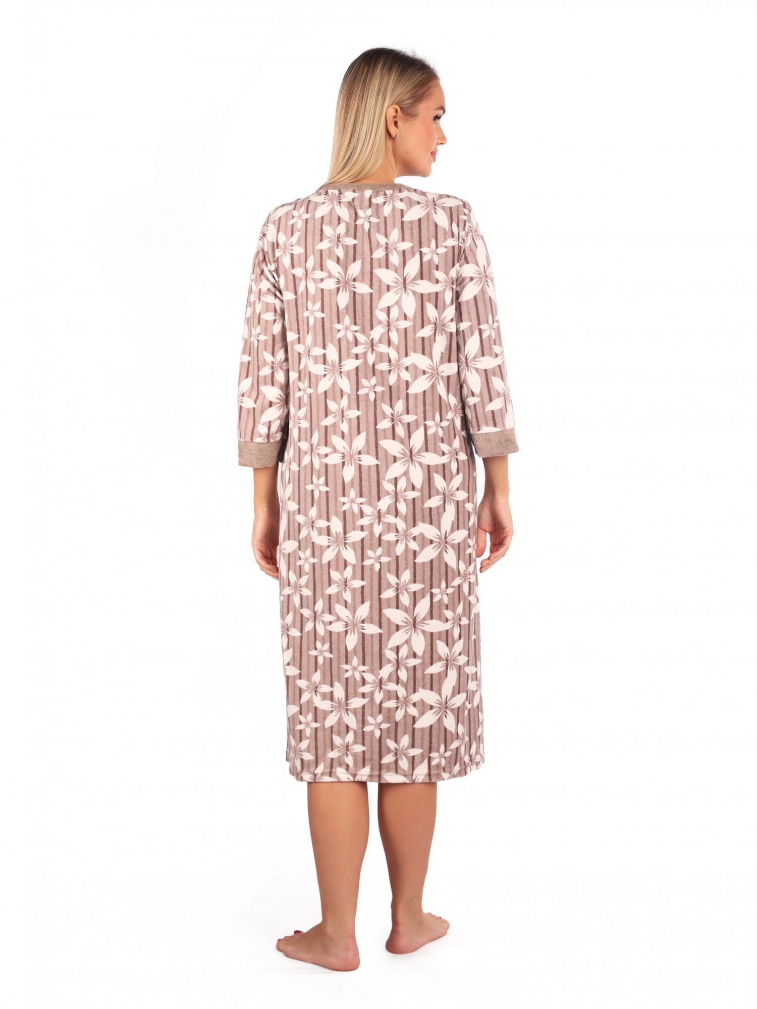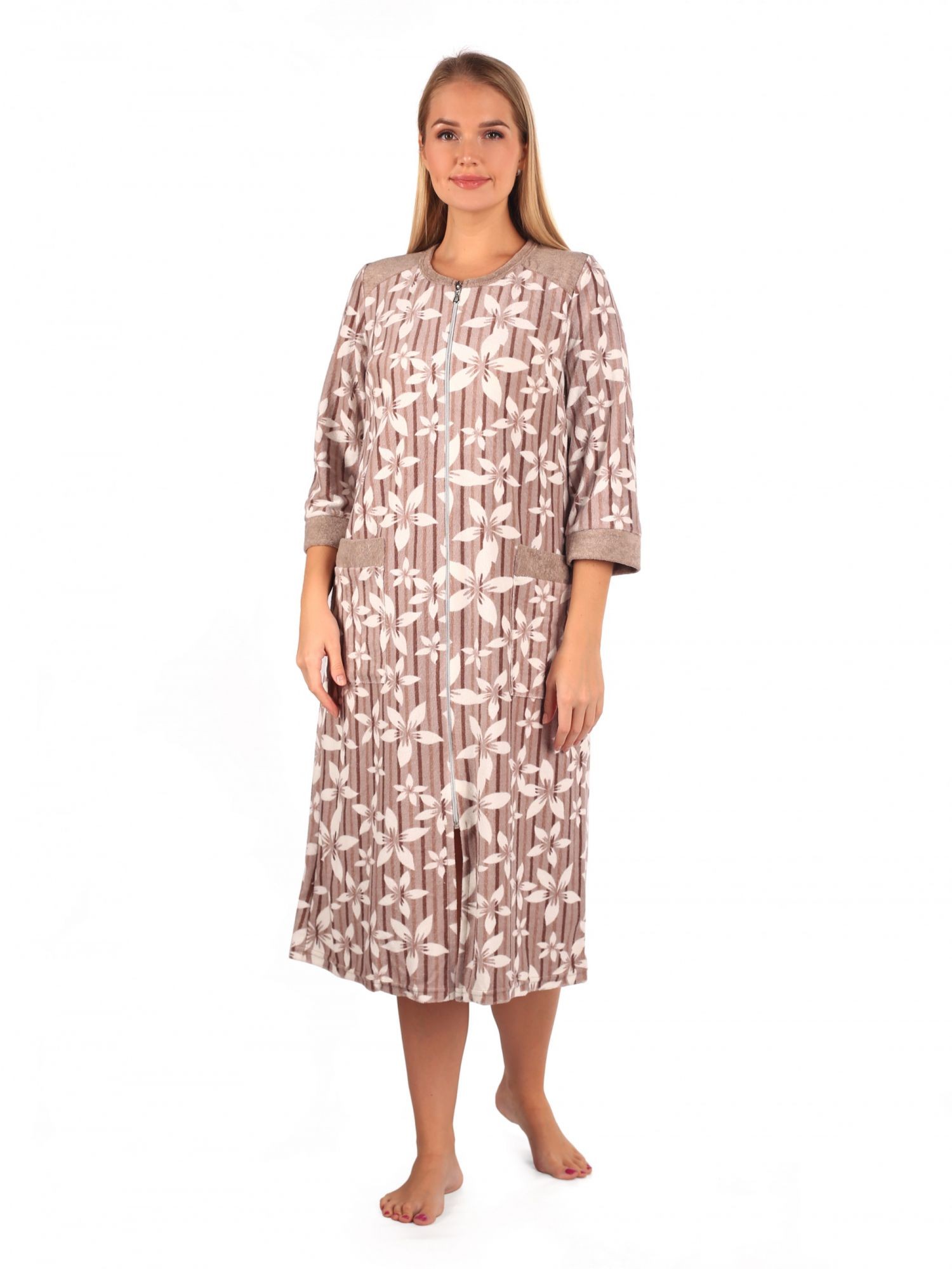 Комфортный женский халат их меланжированной махры. Модель на молнии, с рукавами 3/4, округлым вырезом горловины и двумя накладными карманами. Халат замечательно подойдет для дома и согреет в холодную погоду
