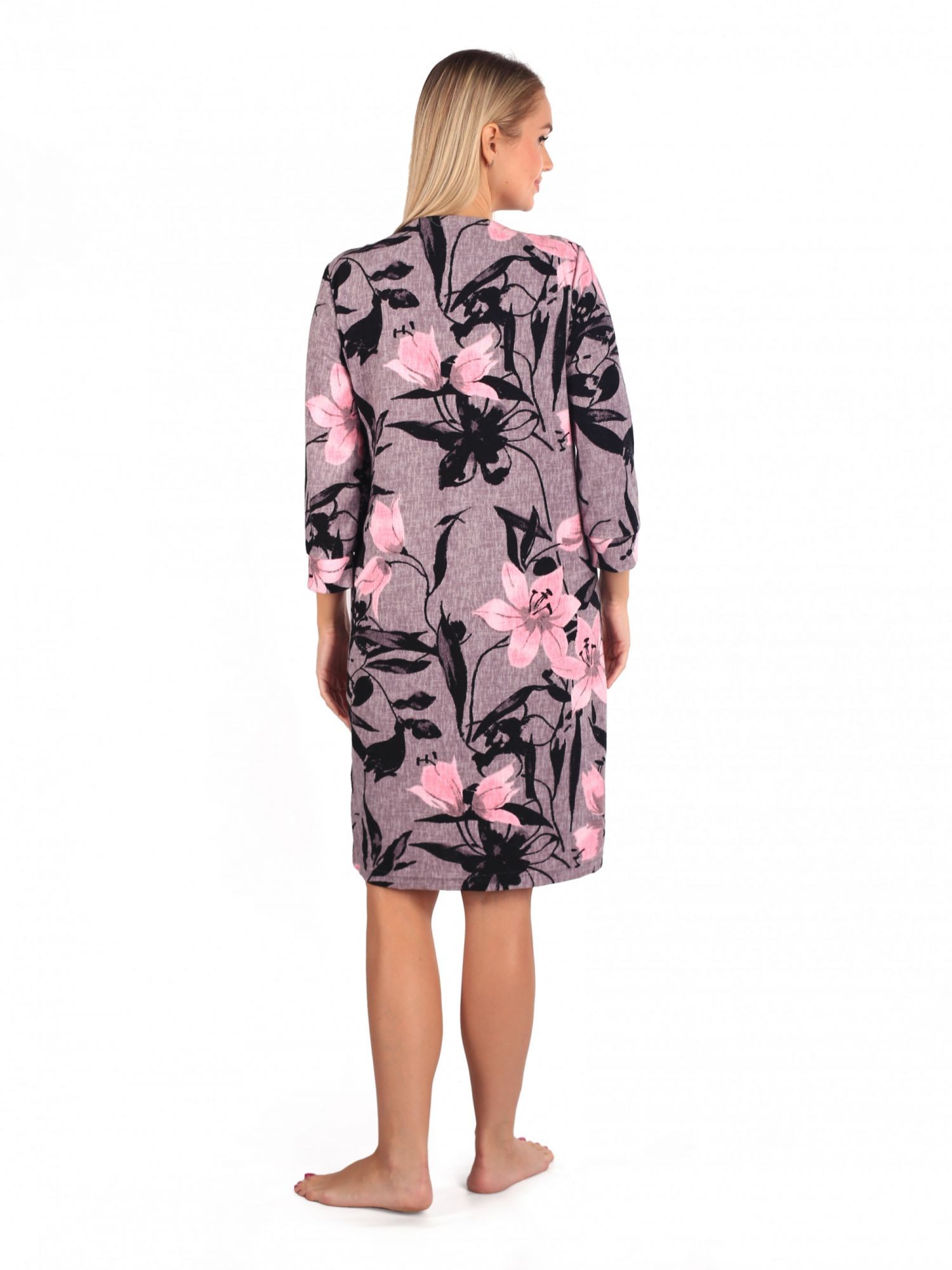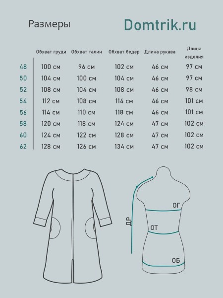Халат женский, тёплый полуприталенного силуэта с центральной застёжкой на молнии . Вырез горловины круглый, обработан обтачкой. Спинка цельнокройная длиной 103 (+/-2) сантиметра. Рукава втачный, удленнёные 40 сантиметров. Карманы в боковых швах.