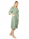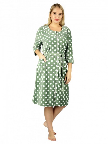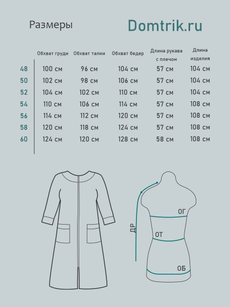 Халат женский, тёплый прямого силуэта с центральной застёжкой на молнии. Вырез горловины круглый, обработан кокеткой под кант. Спинка цельнокройная длиной 103 (+/-2) сантиметра. Рукава втачные, удлиннёные на манжете с кантом, 38 сантиметров. Карманы накладные обработанные планкой под кант. Рост модели 168 сантиметров, размер 48.