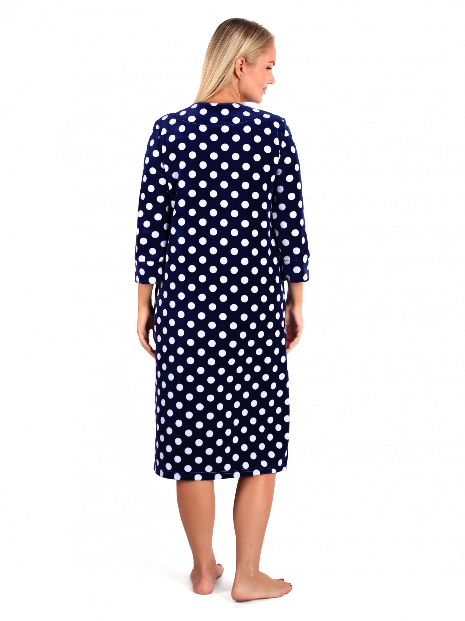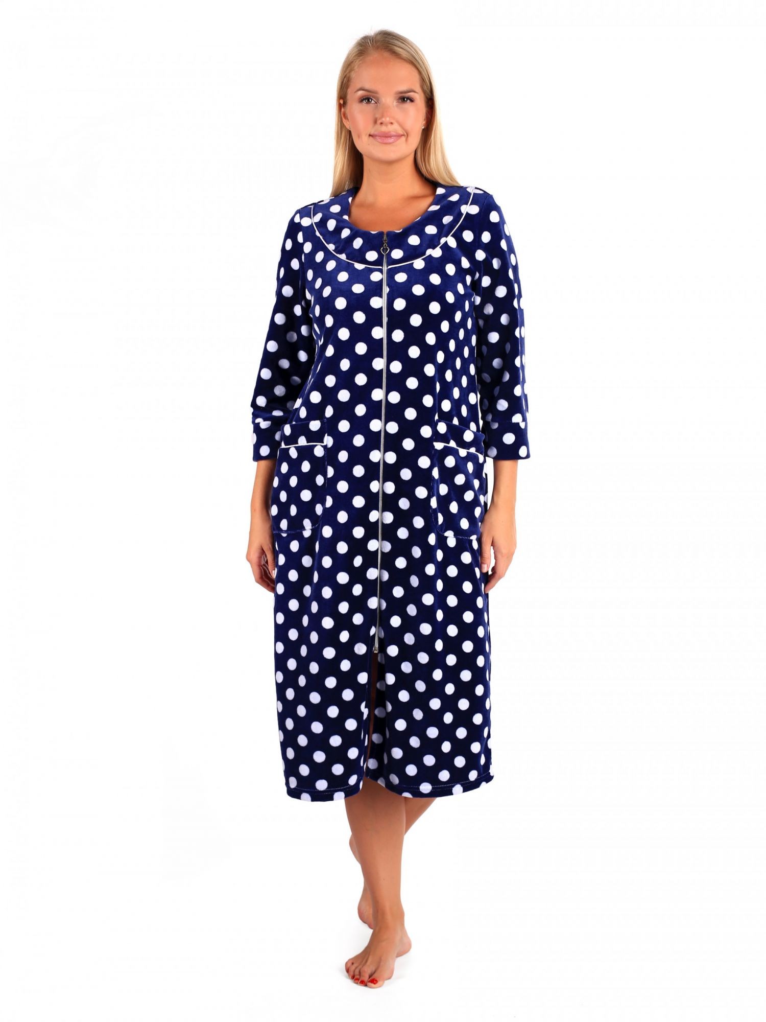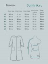 Халат женский, тёплый прямого силуэта с центральной застёжкой на молнии. Вырез горловины круглый, обработан кокеткой под кант. Спинка цельнокройная длиной 103 (+/-2) сантиметра. Рукава втачный, удленнёные на манжете с кантом, 38 сантиметров. Карманы накладные обработанные планкой под кант. Рост модели 168 сантиметров , размер 48.