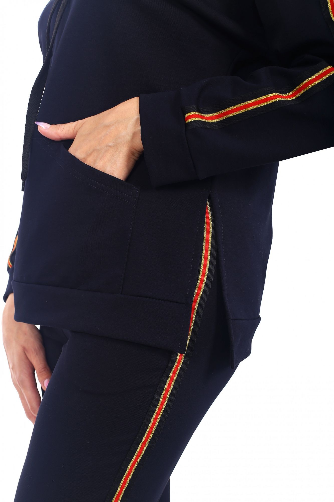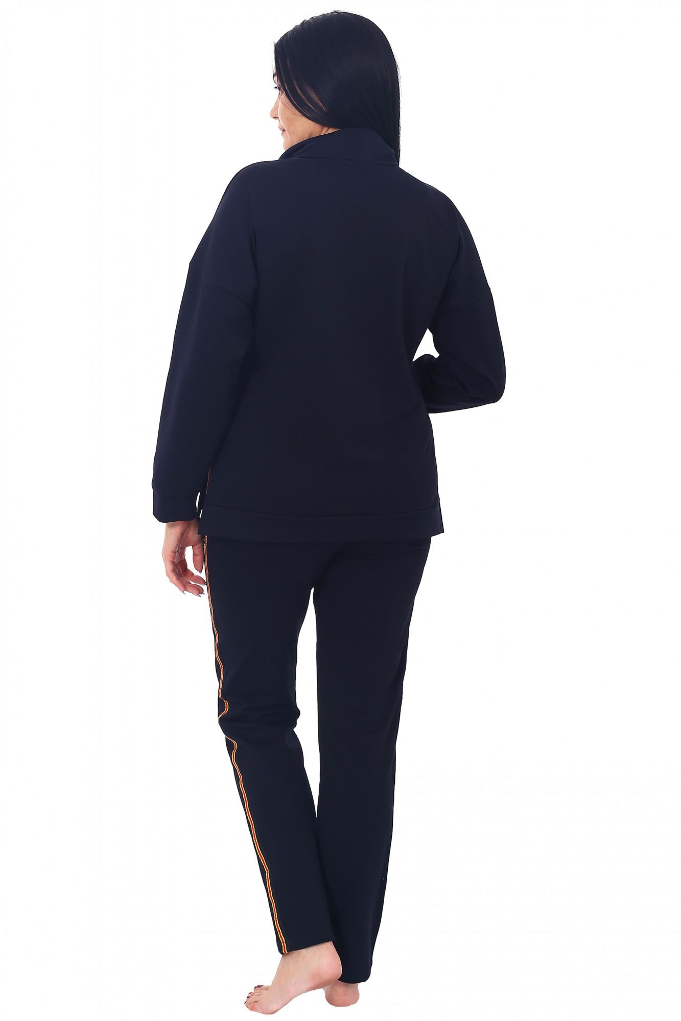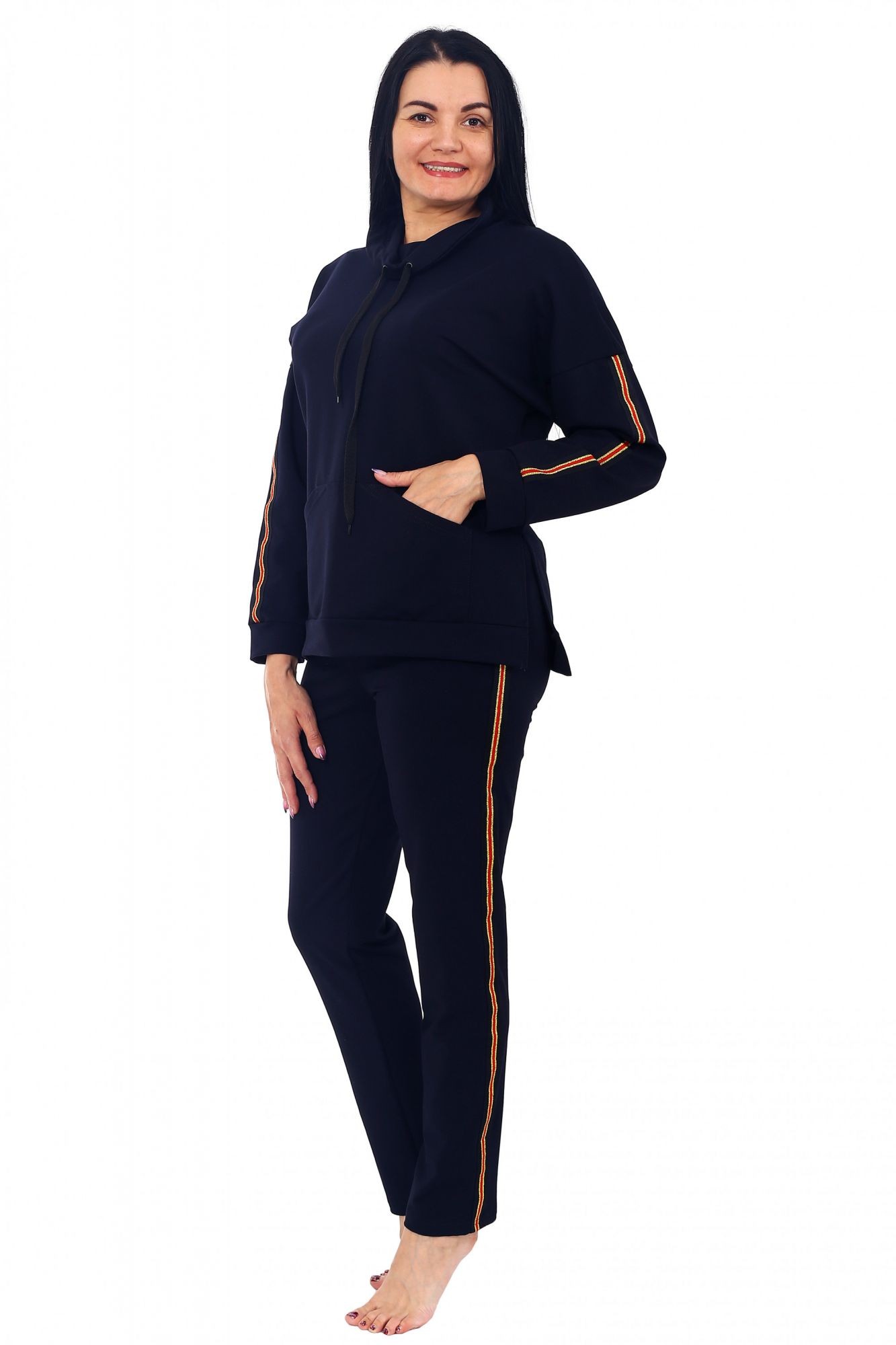 Костюм брючный, прямого силуэта. Кофта длиной 71 +/-3 сантиментра с карманом формы (кенгуру). Рукав длиной 61 сантиметр. Брюки без карманов длиной 107 сантиметров. Рост модели 168 сантиметров, размер 48.