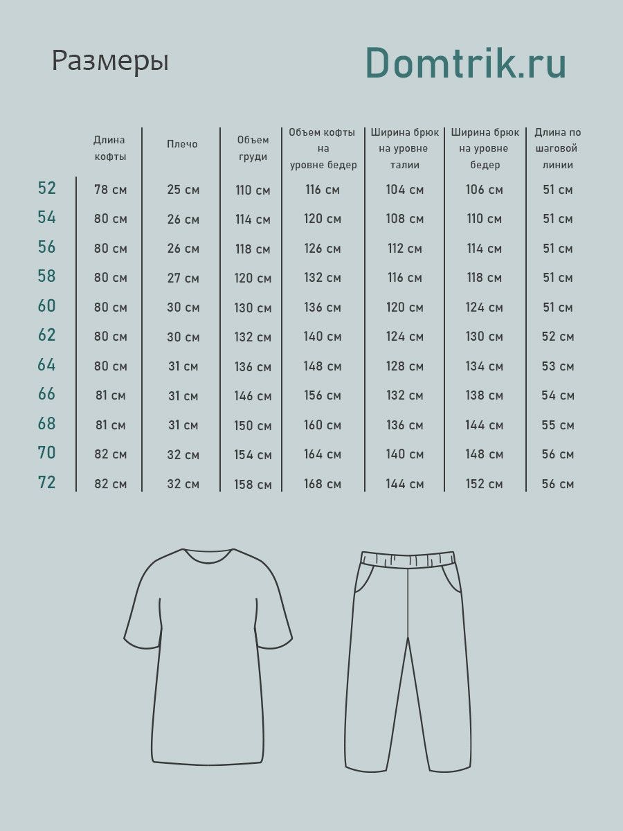 Практичная и удобная модель подойдет как для дома, так и для прогулок на свежем воздухе или занятий спортом. Костюм изготовлен из 100% хлопка, благодаря чему обладает хорошей воздухопроницаемостью. Туника с короткими рукавами, и цветочным принтом. Бриджи облегающие, с карманами в боковом шве бридж, прямого кроя и принтом. Костюм не сковывает движения, а материал приятен на ощупь. Широкий размерный ряд позволяет удовлетворить потребности женщин любой комплекции. В нашем костюме вы будете выглядеть стройно, модно и комфортно при любых обстоятельствах. Размерная сетка включает большие размеры.