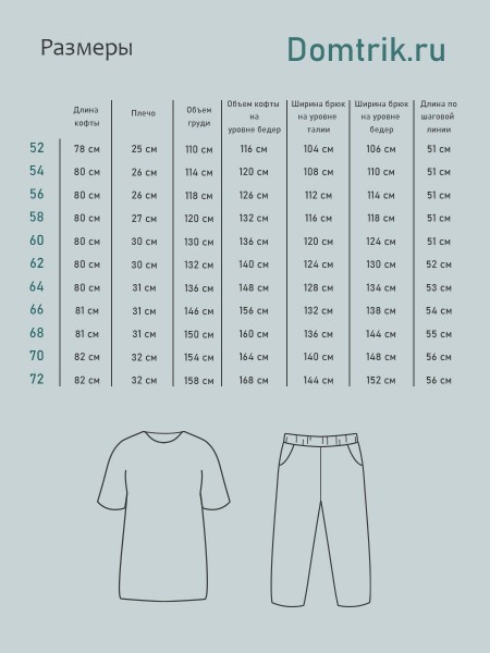 Практичная и удобная модель подойдет как для дома, так и для прогулок на свежем воздухе или занятий спортом. Костюм изготовлен из 100% хлопка, благодаря чему обладает хорошей воздухопроницаемостью. Туника с короткими рукавами, и цветочным принтом. Бриджи облегающие, с карманами в боковом шве бридж, прямого кроя и принтом. Костюм не сковывает движения, а материал приятен на ощупь. Широкий размерный ряд позволяет удовлетворить потребности женщин любой комплекции. В нашем костюме вы будете выглядеть стройно, модно и комфортно при любых обстоятельствах. Размерная сетка включает большие размеры.