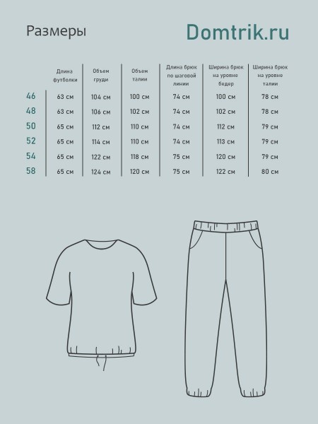 Костюм из кулирки с лайкрой, приятный к телу, повседневный костюм от Домтрик! Костюм не мнется, легко стирается и быстро сохнет, благодаря добавлению лайкры не деформируется и не теряет цвет после многочисленных стирок. Брюки на резинке, с карманами в боковом шве. Футболка на шнурке,что позволяет создать разные красивые образы и регулировать длинну кофты.
