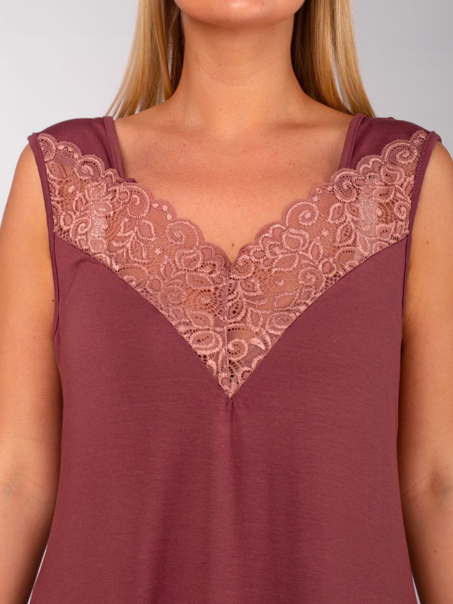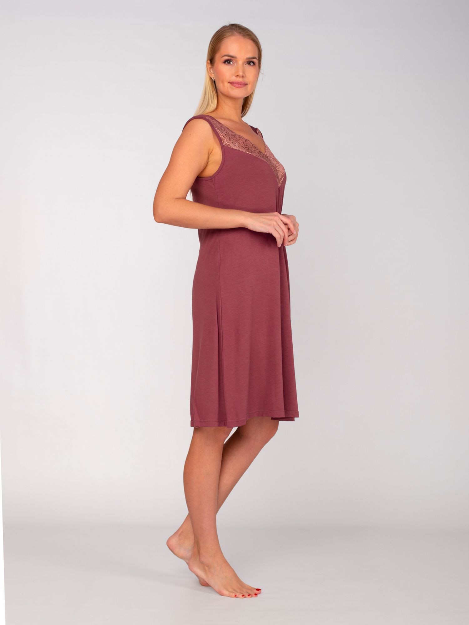 Сорочка трапециевидного силуэта. На полочке располагаются оригинальная кокетка фигурной формы из широкого кружева и фигурные бретели из основной ткани. Горловина, бретели и пройма обработаны окантовкой. Нижний срез обработан швом в подгибку. Длина изделия 95-112см.