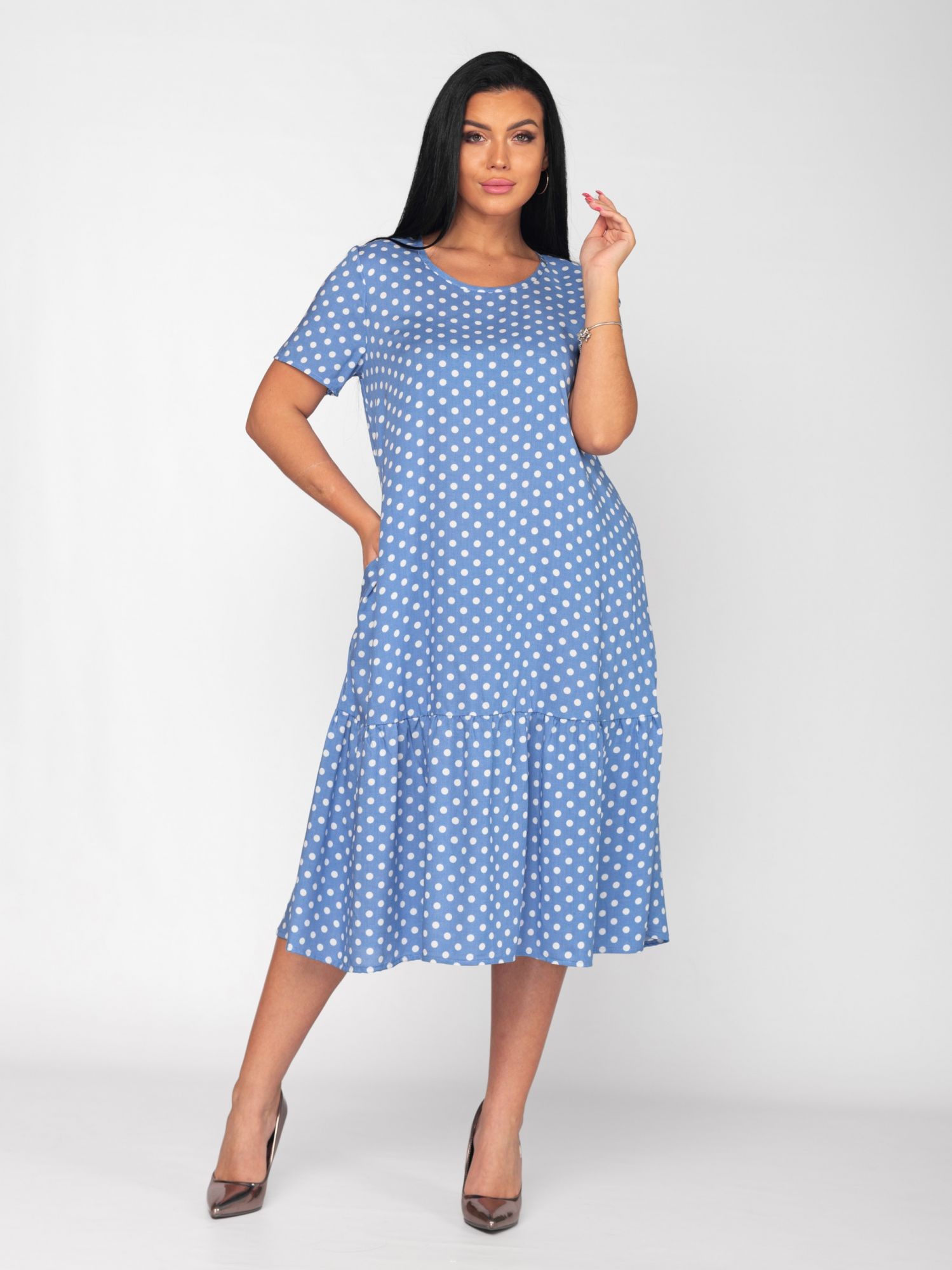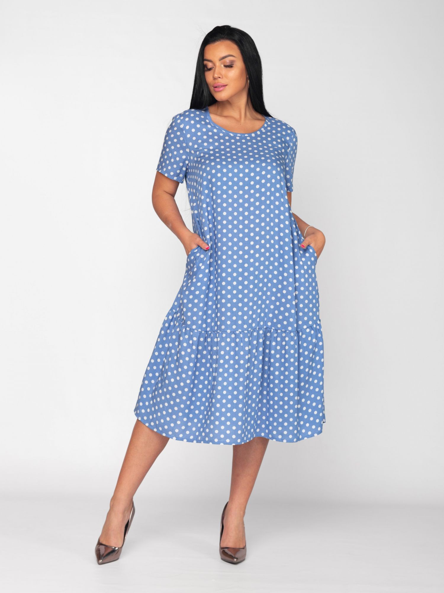 Летнее женское платье длины миди, выполнено из тонкого вискозного штапеля, легкое, мягкое и приятное к телу.Свободного кроя. Платье с классическим принтом в горох станет настоящей находкой в офис, на работу, на учебу, для путешествий, в отпуск, для прогулок.
